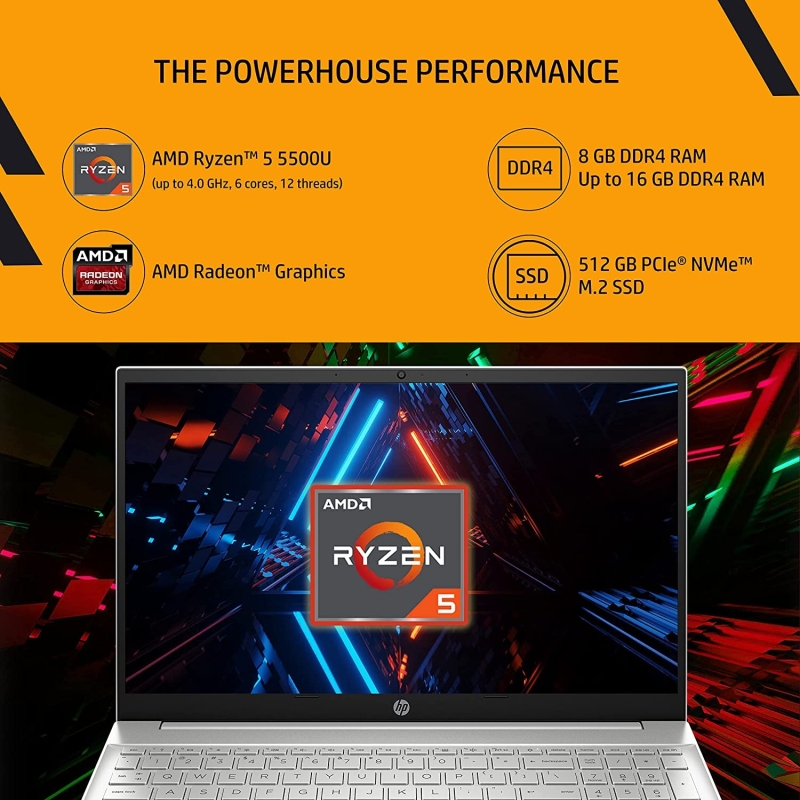 • Processor: AMD Ryzen 5 5500U (up to 4.0 GHz max boost clock, 8 MB L3 cache, 6 cores, 12 threads)