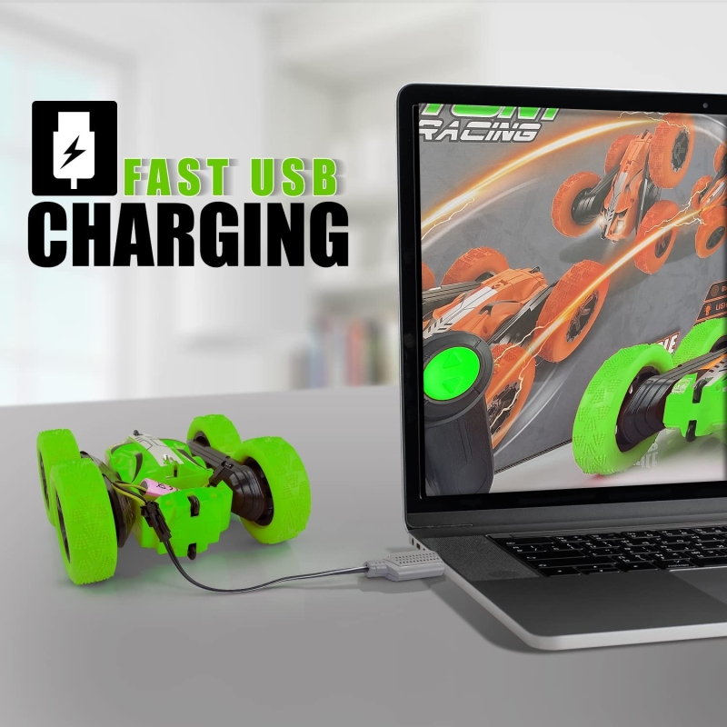 • 360° ROTATING STUNT: Double sides running, moving forward, backward, turning left, right, 360 degree tumbling flip for different playing experience on this electric remote control stunt car. You can control the rc cars for kids in any direction with its remote controller.