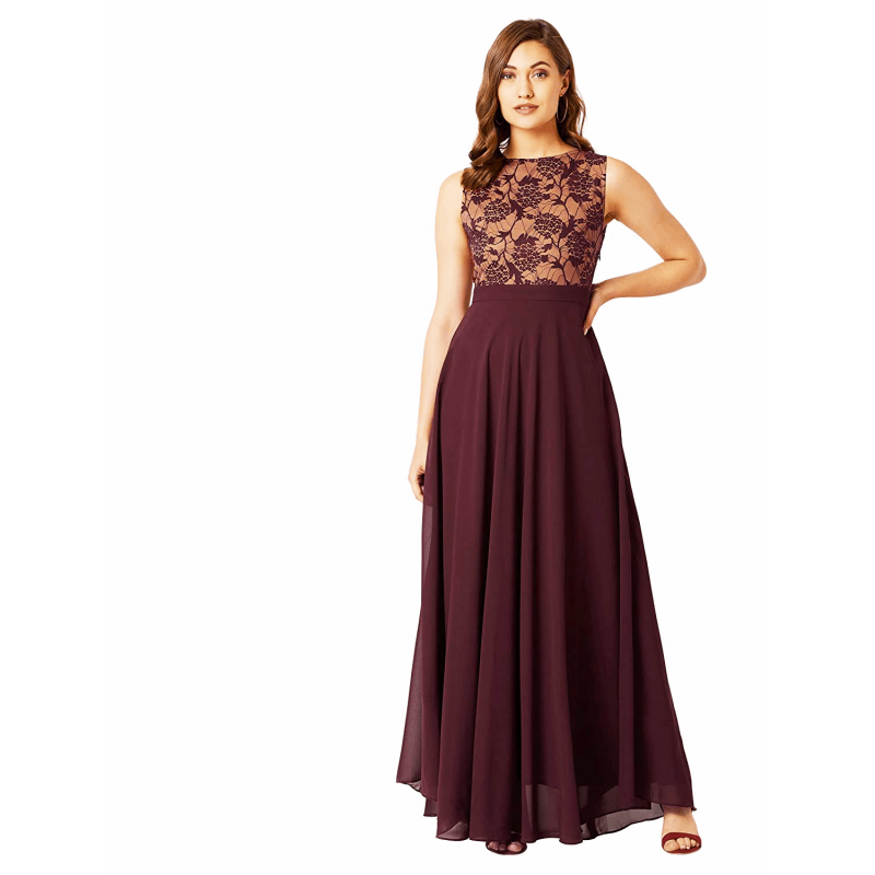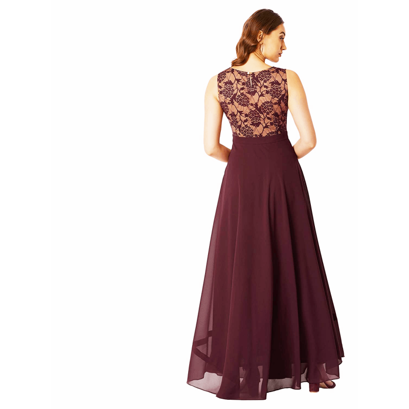 Miss Chase Women's Lavender Round Neck Sleeveless Solid Lace Overlaid Maxi Dress