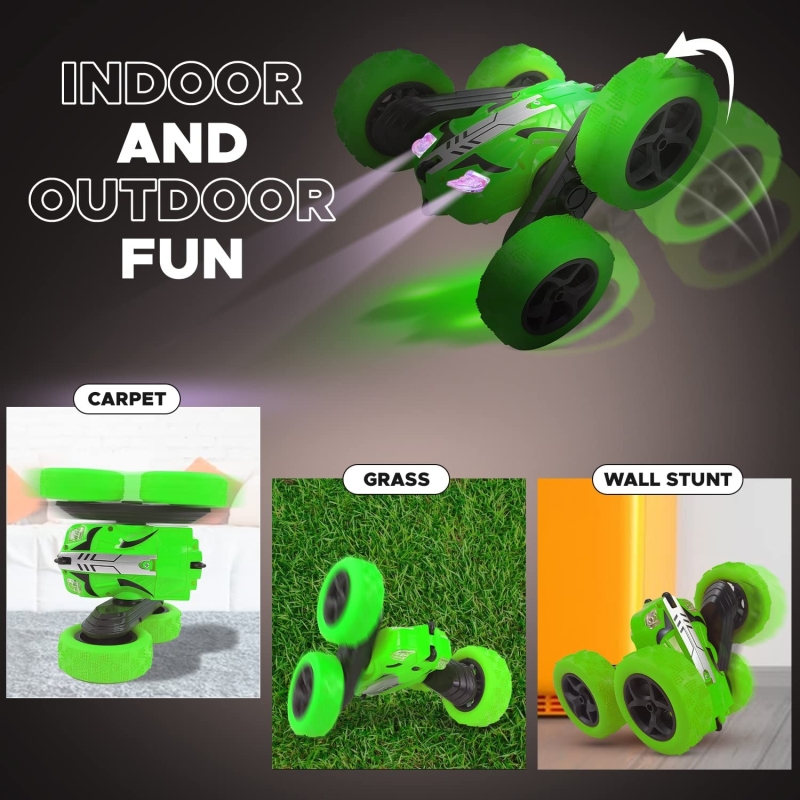 • 360° ROTATING STUNT: Double sides running, moving forward, backward, turning left, right, 360 degree tumbling flip for different playing experience on this electric remote control stunt car. You can control the rc cars for kids in any direction with its remote controller.